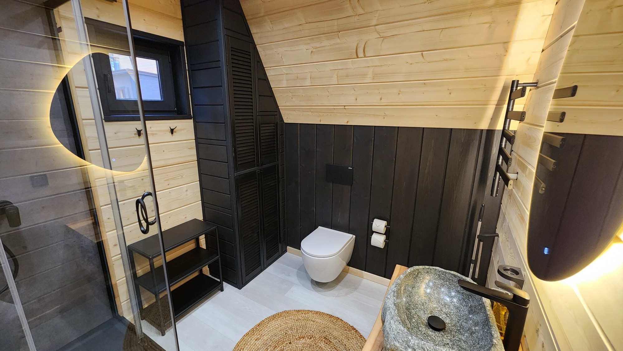 • всё необходимое: душ, унитаз, раковина, полотенцесушитель, вешалка и термометр;